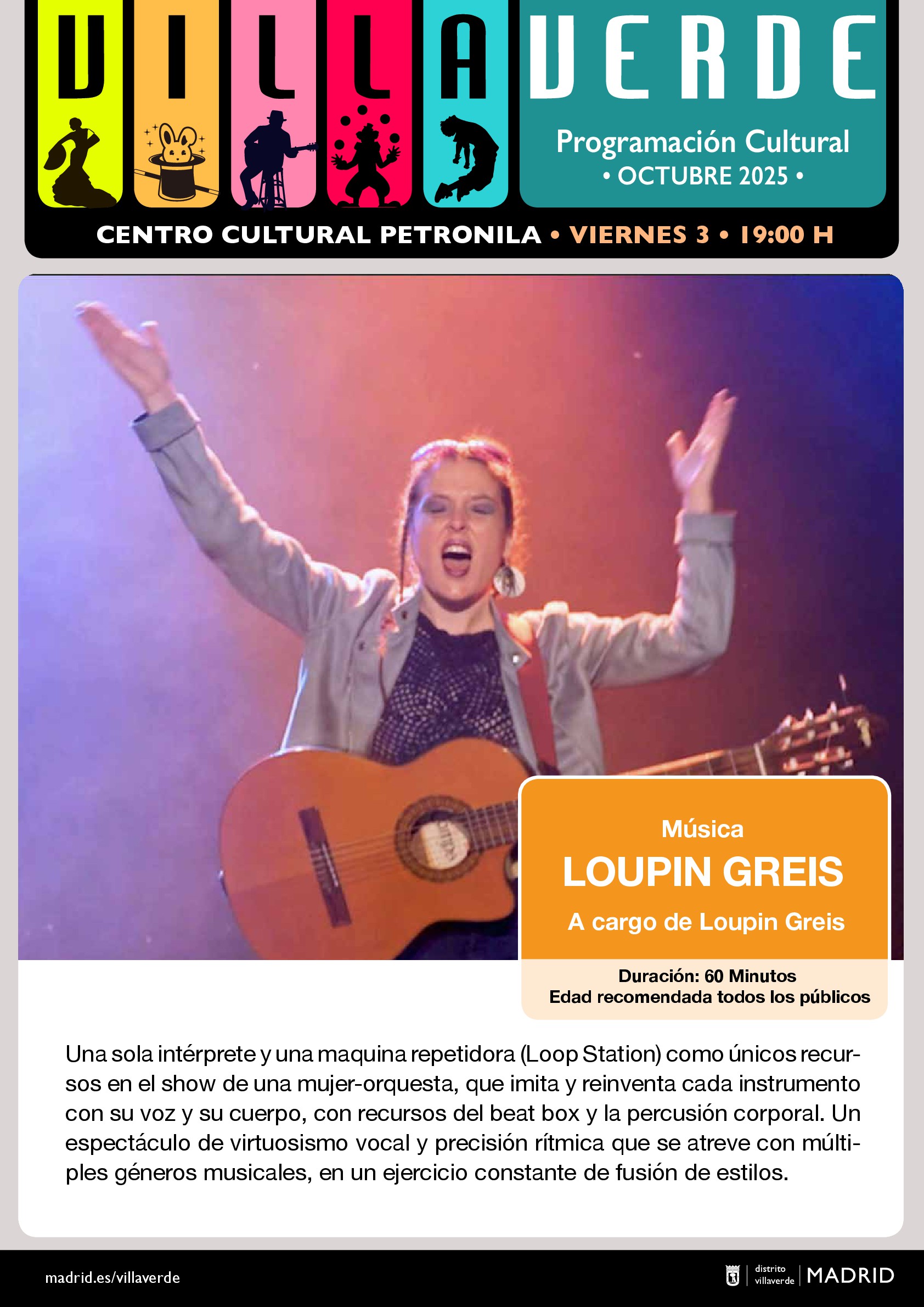 La artista Loupin Greis y la márquina repetidora, Loop Station, presenta este show en el que una mujer-orquesta, imita y reinventa cada instrumento con su voz y su cuerpo, con recursos del beat box y la percusión corporal. Un espectáculo de virtuosismo vocal y precisión rítmica que se atreve con múltiples géneros musicales, en un ejercicio constante de fusión de estilos.