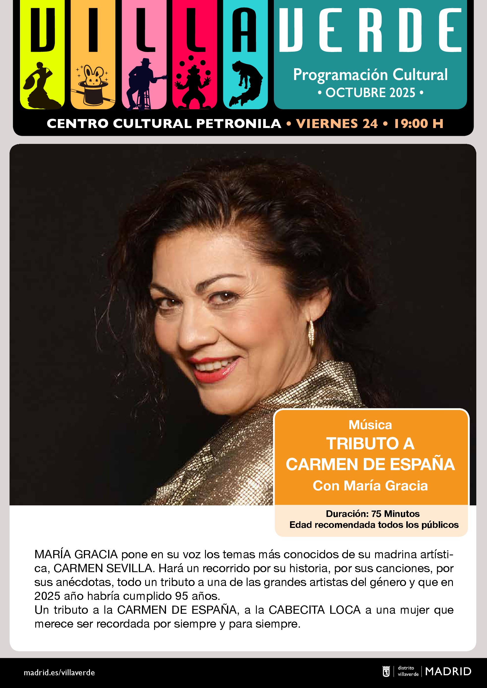 La cantante María García hará un recorrido por la historia artística de Carmen Sevilla, por sus canciones, por sus anécdotas, todo un tributo a una de las grandes artistas del género y que en 2025 año habría cumplido 95 años.