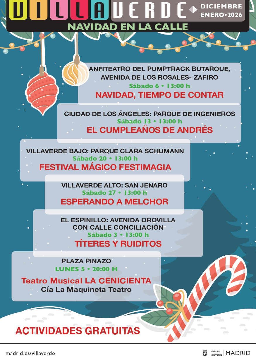 Además, la Navidad también sale a la calle para llevar la cultura a todos los rincones. El sábado 6, en el anfiteatro del Pumptrack de Butarque representarán la función Navidad, tiempo de contar. En el parque de Ingenieros, habrá la función de títeres El cumpleaños de Andrés el sábado 13. Después el día 20, los más pequeños podrán disfrutar del festival Festimagia, y el sábado 27, en San Jenaro, el teatro de calle representará Esperando a Melchor. El 3 de enero, en El Espinillo, en la calle Orovilla con calle Conciliación, se podrá disfrutar de Títeres y Ruiditos.