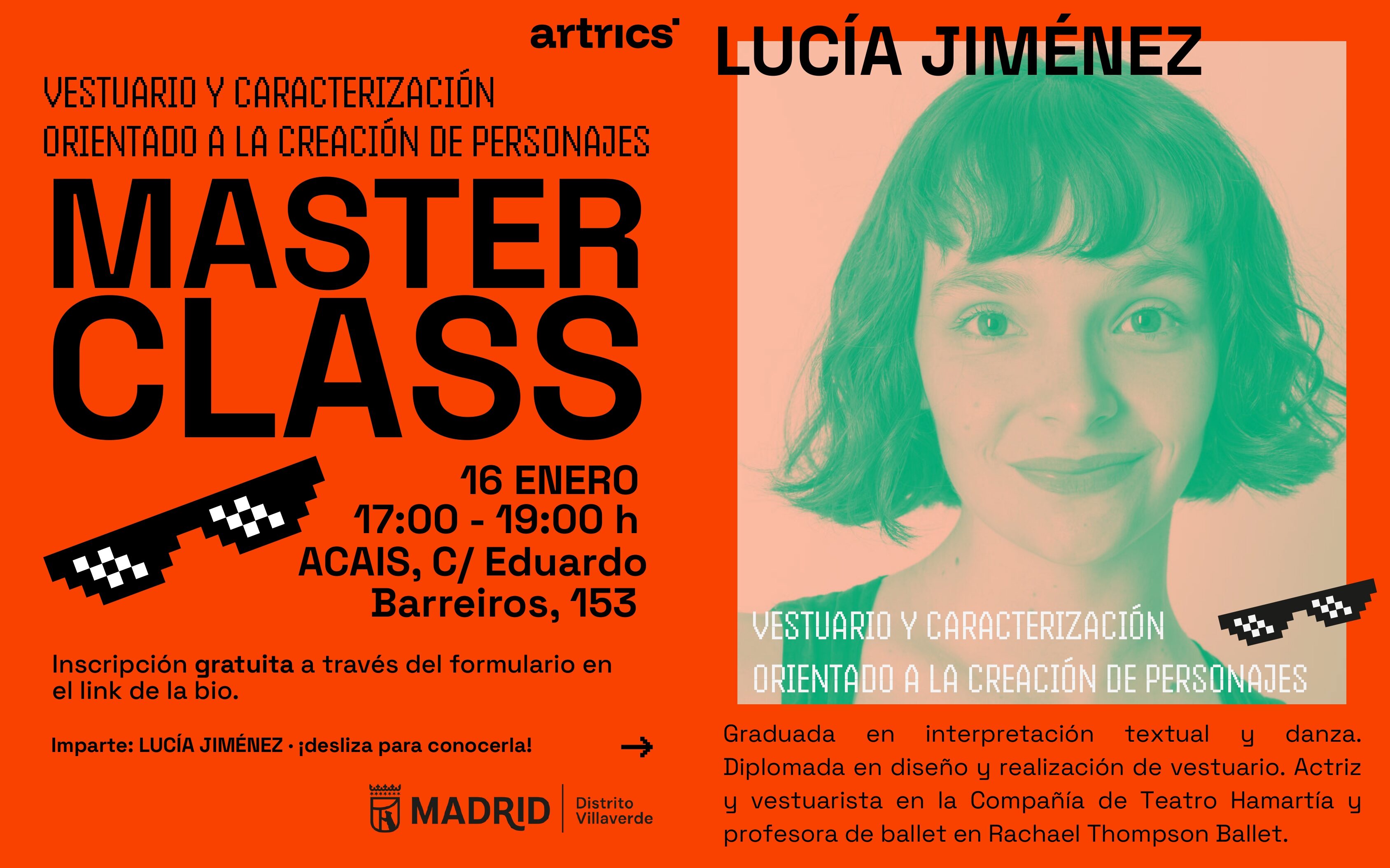 La primera será el viernes 16 de enero sobre ‘Vestuario y Caracterización’ orientada a la creación de personajes. Impartirá la clase Lucía Jiménez, que buscará acercar a los participantes en el curso al proceso creativo de construcción de personajes a través del vestuario y la caracterización, como herramientas narrativas y expresivas fundamentales.