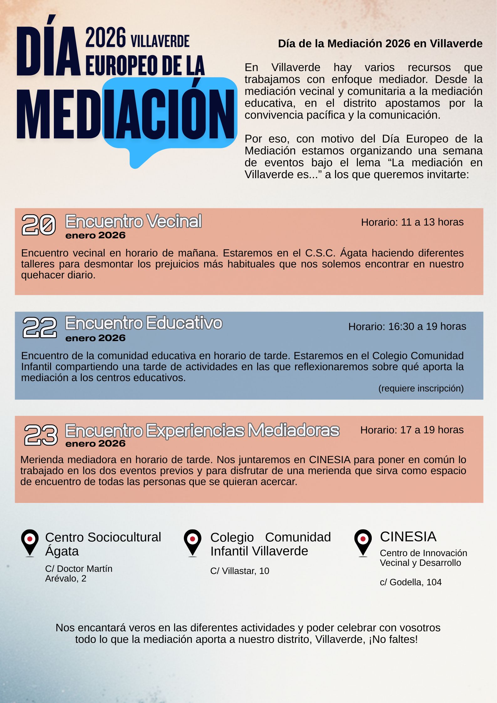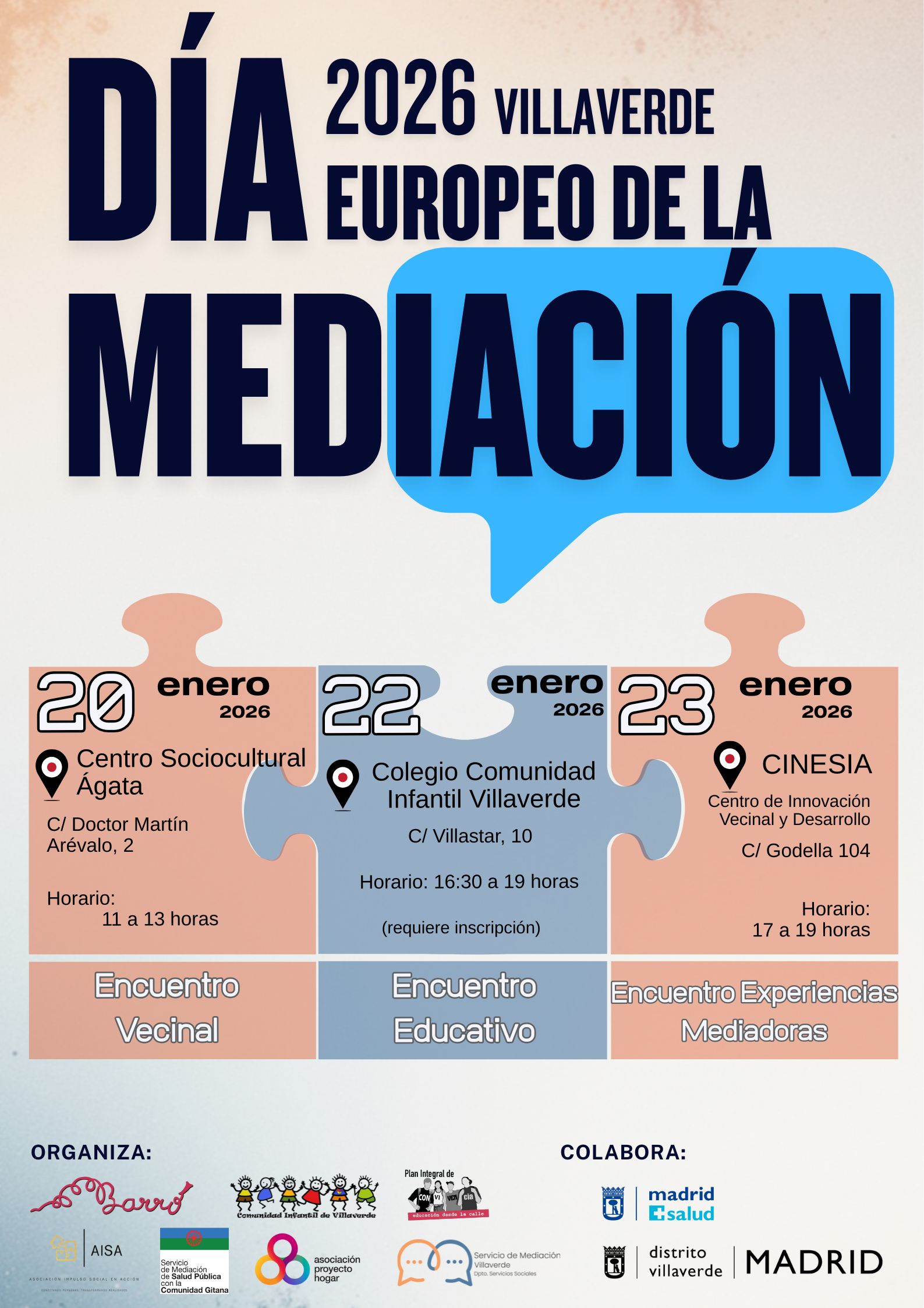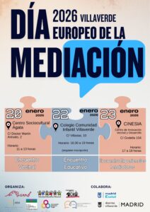 Por eso, con motivo del Día Europeo de la Mediación, -que se celebra el 21 de enero-, realizamos una semana de eventos bajo el lema ‘La mediación en Villaverde es…’ a los que están invitada la ciudadanía para que disfruten de las actividades que se han programado: