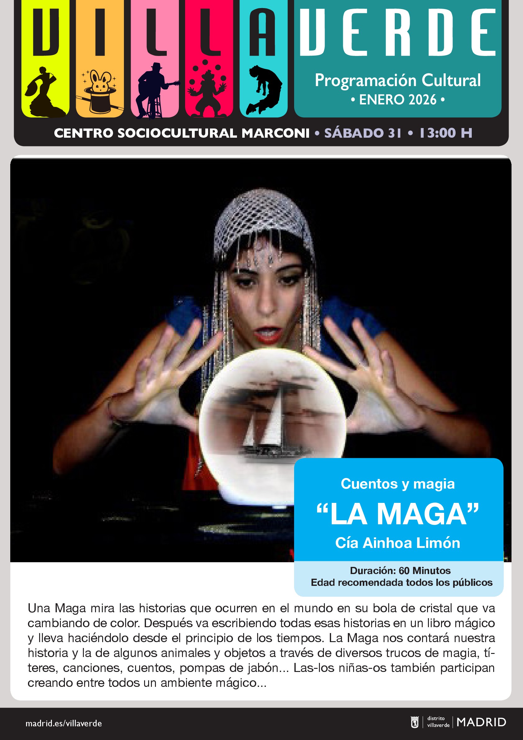 Una Maga mira las historias que ocurren en el mundo en su bola de cristal que va cambiando de color. Después va escribiendo todas esas historias en un libro mágico y lleva haciéndolo desde el principio de los tiempos. La Maga nos contará nuestra historia y la de algunos animales y objetos a través de diversos trucos de magia, títeres, canciones, cuentos, pompas de jabón en el que participarán los más pequeños.