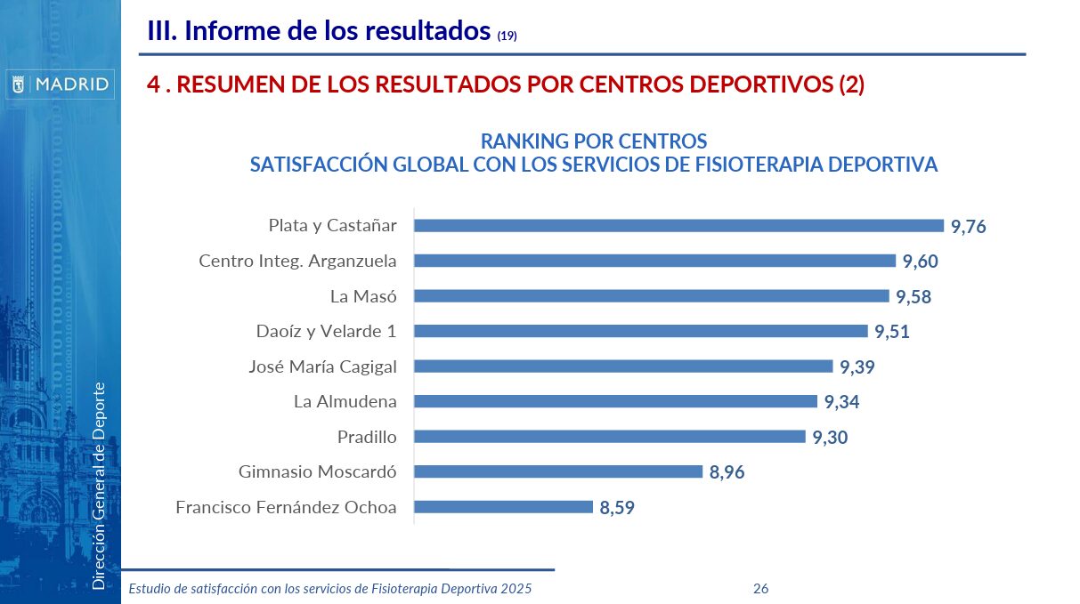 El servicio de fisioterapia del Centro Deportivo Municipal Plata y Castañar, ubicado en Villaverde, ha recibido una valoración muy positiva por parte de sus usuarios, según los resultados del último estudio municipal de satisfacción sobre servicios deportivos.